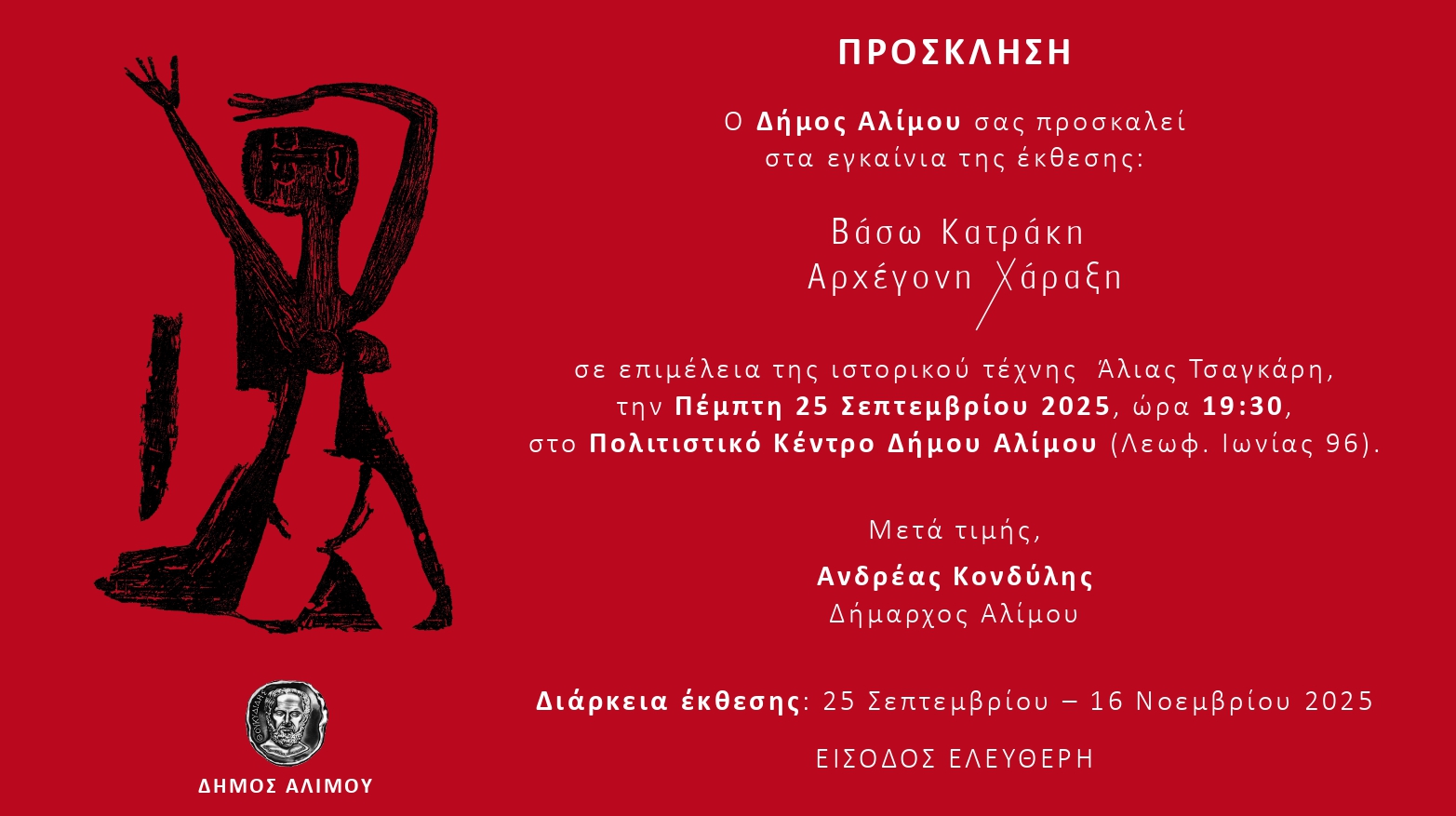 Η Δημοτική Πινακοθήκη Δήμου Αλίμου εγκαινιάζει την έκθεση Βάσω Κατράκη: Αρχέγονη Χάραξη, σε επιμέλεια της ιστορικού τέχνης Άλιας Τσαγκάρη, η οποία αναδεικνύει τη ριζοσπαστική συμβολή της δημιουργού στη διαμόρφωση μιας μνημειακής γλώσσας χαρακτικής που αναμόρφωσε τον εικαστικό λόγο του 20ού αιώνα.