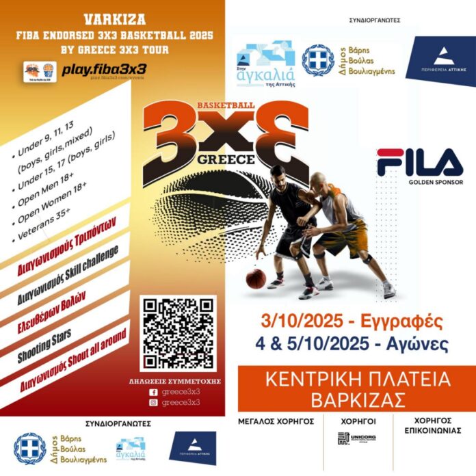 Η Βάρκιζα γίνεται ξανά το επίκεντρο του μπάσκετ δρόμου! Από 3 έως 5 Οκτωβρίου 2025, η κεντρική πλατεία της πόλης φιλοξενεί για πέμπτη συνεχή χρονιά το Varkiza FIBA Endorsed 3×3 Tournament, ένα τουρνουά – θεσμό που έχει κερδίσει τη θέση του στο διεθνές καλαντάρι της FIBA.