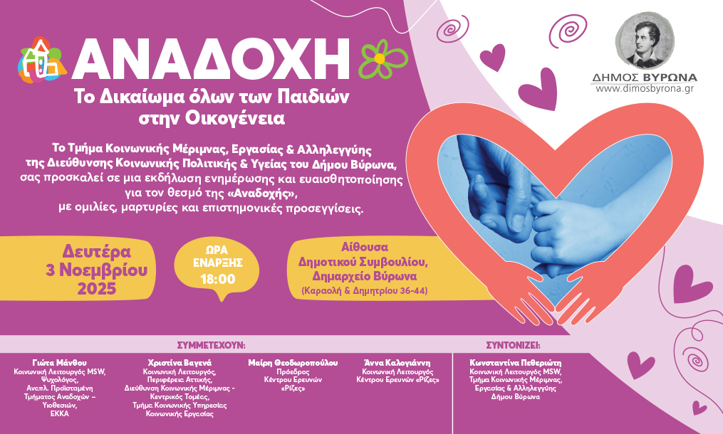 Το Τμήμα Κοινωνικής Μέριμνας, Εργασίας & Αλληλεγγύης της Διεύθυνσης Κοινωνικής Πολιτικής & Υγείας του Δήμου Βύρωνα σας προσκαλεί στην εκδήλωση ενημέρωσης και ευαισθητοποίησης με θέμα: ΑΝΑΔΟΧΗ – Το Δικαίωμα όλων των Παιδιών στην Οικογένεια