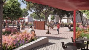 Τα υφιστάμενα δέντρα θα διατηρηθούν και το πράσινο θα ενισχυθεί σημαντικά, με φυτεύσεις δέντρων μεγάλης ανάπτυξης και καλλωπιστικών φυτών. Η χρήση ανακυκλώσιμων και οικολογικών υλικών – όπως βοτσαλωτά δάπεδα και κυβόλιθοι υψηλής θερμικής απορροφητικότητας – υποστηρίζει τη βιοκλιματική αναβάθμιση της πλατείας και δημιουργεί ευνοϊκό μικροκλίμα, ακολουθώντας τις αρχές της αειφόρου ανάπτυξης.