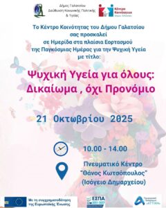 Το Κέντρο Κοινότητας Δήμου Γαλατσίου σας προσκαλεί σε μια ιδιαίτερη ημερίδα αφιερωμένη στην Παγκόσμια Ημέρα Ψυχικής Υγείας, την Τρίτη 21 Οκτωβρίου 2025, από τις 10:00 έως τις 14:00, στο Πνευματικό Κέντρο “Θάνος Κωτσόπουλος” (Ισόγειο Δημαρχείου).