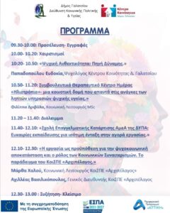 Μαζί θα μιλήσουμε για την ψυχική ανθεκτικότητα, την ένταξη στην εργασία, την κοινωνική αποκατάσταση και το δικαίωμα όλων στην ψυχική ευεξία Ομιλητές από το Κέντρο Κοινότητας, τη ΔΥΠΑ, το Κέντρο Ημέρας «Ηλιόστροπο» και τον Κοινωνικό Συνεταιρισμό «Αρχιπέλαγος».