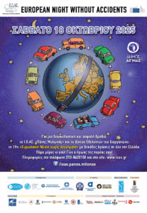 Ο Δήμος Αίγινας σε συνεργασία με το Ινστιτούτο Οδικής Ασφάλειας Ι.Ο.ΑΣ. «Πάνος Μυλωνάς» σας προσκαλεί να συμμετάσχετε στην εκδήλωση με τίτλο «Ευρωπαϊκή Νύχτα Χωρίς Ατυχήματα» το Σάββατο 18 Οκτωβρίου 2025 και ώρα 19:30 στην Παλαιά Προβλήτα του λιμανιού της Αίγινας.