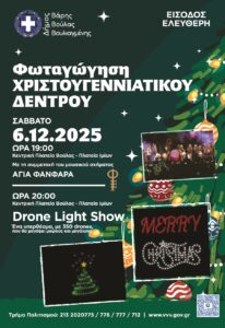 Σειρά χριστουγεννιάτικων εκδηλώσεων για παιδικό και ενήλικο κοινό διοργανώνει ο Δήμος Βάρης Βούλας Βουλιαγμένης για τη γιορτινή περίοδο. Οι εκδηλώσεις περιλαμβάνουν συναυλίες με καταξιωμένους καλλιτέχνες, χορωδιακά αφιερώματα, live street events, παιδικό θέατρο, αφήγηση παραμυθιών, χριστουγεννιάτικο χωριό στη Βούλα με εργαστήρια παιχνιδιών, δράσεων, εικαστικών, μουσικής και χορού, πολιτιστικών δρώμενων, εκπαιδευτικών προγραμμάτων και πολλές πολλές εκπλήξεις… (διάρκειας 11 ημερών). Παράλληλα φέτος το Χριστουγεννιάτικο δέντρο της πόλης θα φωταγωγηθεί με τη «βοήθεια» 350 drones, το μεγαλύτερο drone light show που έχει γίνει σε Δήμο της χώρας.