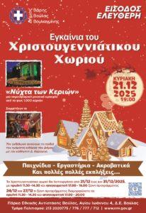 Από τις 21 Δεκεμβρίου έως και τις 31 Δεκεμβρίου 2025, θα πραγματοποιηθούν σε καθημερινή βάση, μια σειρά χριστουγεννιάτικων εκδηλώσεων, δρωμένων, εργαστηρίων, παιχνιδιών και παραστάσεων, στο πλαίσιο ενός χριστουγεννιάτικου χωριού, που θα λειτουργήσει στο Πάρκο Εθνικής Αντίστασης Βούλας ,για 11 ημέρες.