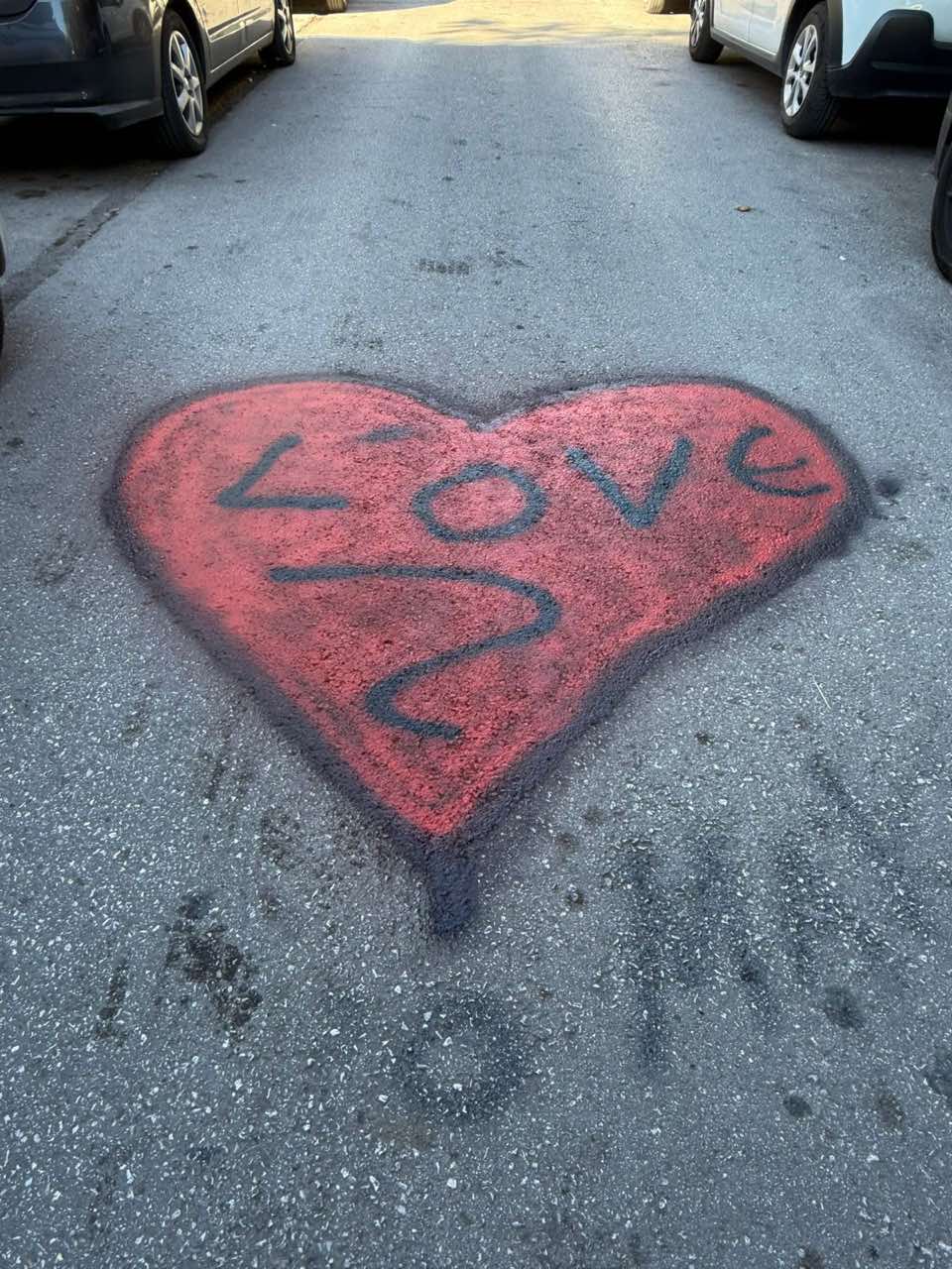 Μια απροσδόκητη πινελιά ρομαντισμού εμφανίστηκε στην οδό Περικλέους στο Ψυχικό, όπου οι κάτοικοι βρήκαν μια μεγάλη κόκκινη καρδιά, ζωγραφισμένη στη μέση του δρόμου, με τη λέξη LOVE στο κέντρο της. Δεν πρόκειται για ένα συνηθισμένο γκράφιτι σε κάποιον τοίχο. Είναι μια προσεκτικά φτιαγμένη εικόνα, τοποθετημένη εκεί όπου κανείς δεν την περιμένει πάνω στην άσφαλτο.