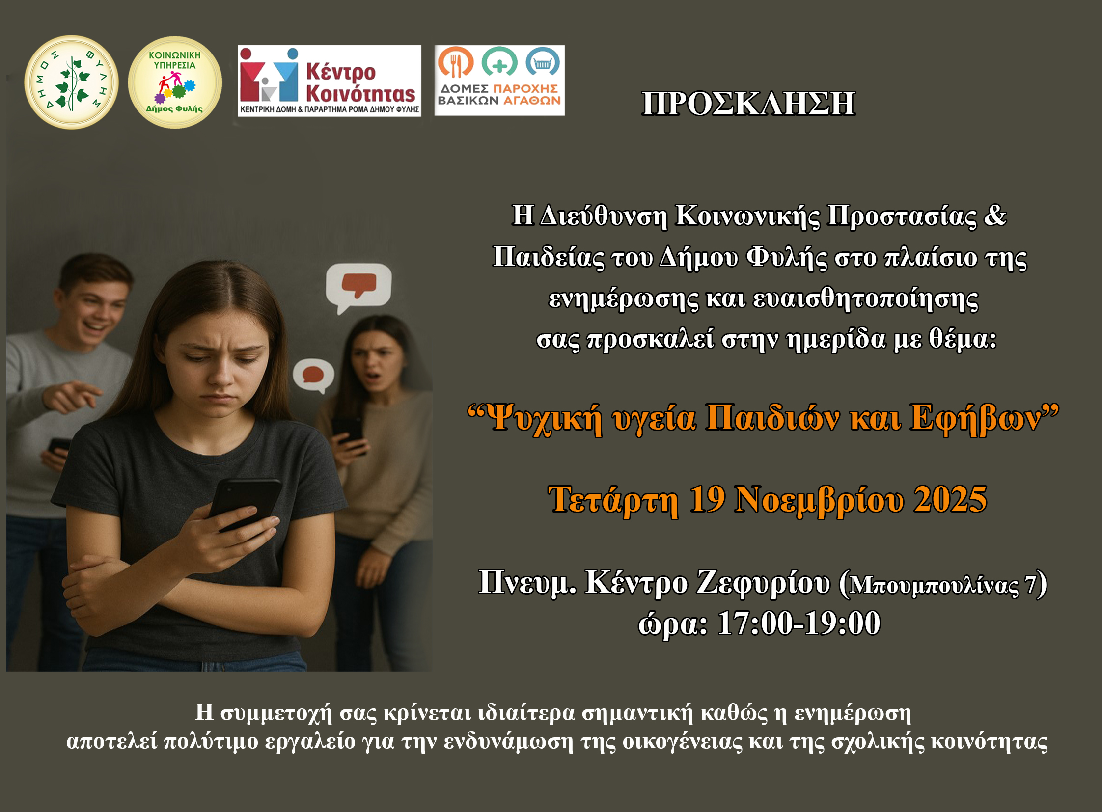 Η Διεύθυνση Κοινωνικής Προστασίας και Παιδείας του Δήμου Φυλής στο πλαίσιο ενημέρωσης, ευαισθητοποίησης και πρόληψης διοργανώνει και σας προσκαλεί σε ενημερωτική δράση σχετικά με την Ψυχική Υγεία Παιδιών και Εφήβων , την Τετάρτη στις 17:00, 19 Νοεμβρίου στο Πνευματικό Κέντρο Ζεφυρίου.