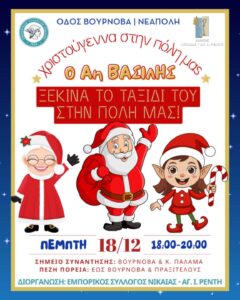 «Ο Αη Βασίλης ξεκινά το ταξίδι του στην πόλη μας» την Πέμπτη 18 Δεκεμβρίου, ώρα 6.00 μ.μ έως 8.00 μ.μ. Η εορταστική πορεία θα ξεκινήσει από τη συμβολή των οδών Βουρνόβα και Κωστή Παλαμά στη Νεάπολη και θα φτάσει έως Βουρνόβα και Πραξιτέλους. Ο Αη Βασίλης και η μασκότ Stitch θα μοιράσουν δώρα, θα προσφέρουν Πιστοποιητικό «Καλού Παιδιού 2025» και θα παραλάβουν γράμματα και ευχές από τα παιδιά. Στη δράση συμμετέχουν και οι βοηθοί του Αη Βασίλη.