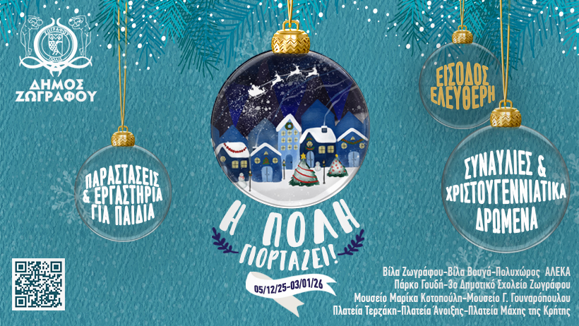 Από τις 5 Δεκεμβρίου έως τις 3 Ιανουαρίου, ο Δήμος Ζωγράφου φοράει τα γιορτινά του και καλεί μικρούς και μεγάλους για έναν ολόκληρο μήνα γεμάτο φως, μουσική, παιδικά χαμόγελα και πολιτισμό!