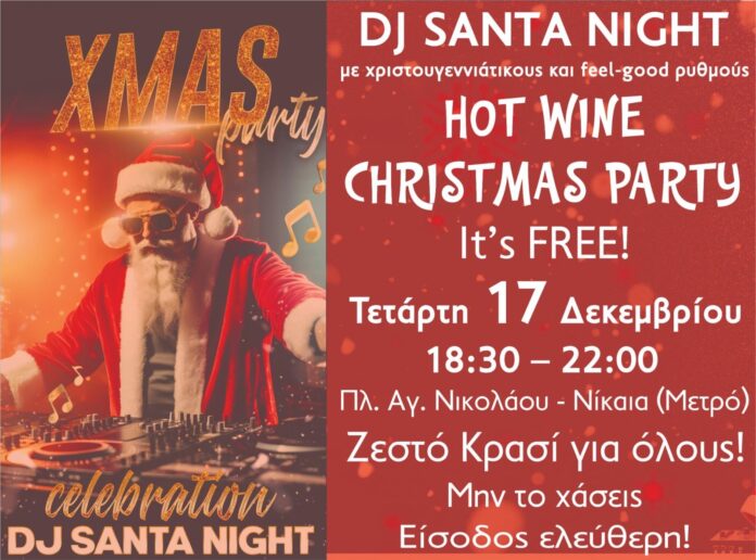 Μια ξεχωριστή χριστουγεννιάτικη γιορτή DJ Santa Night, γεμάτη μουσική, κέφι και ρυθμό διοργανώνει ο Δήμος Νίκαιας-Αγ.Ι. Ρέντη, την Τετάρτη 17 Δεκεμβρίου, από τις 18:30 έως τις 22:00, στην πλατεία Αγίου Νικολάου στη Νίκαια, σε απόσταση αναπνοής από τον σταθμό Μετρό.