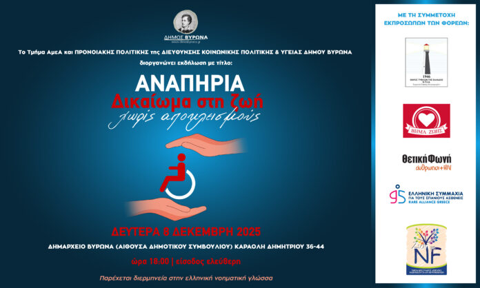 Το Τμήμα ΑμεΑ & Προνοιακής Πολιτικής της Διεύθυνσης Κοινωνικής Πολιτικής & Υγείας του Δήμου Βύρωνα, με τη συμμετοχή εκπροσώπων από το « Φάρο Τυφλών της Ελλάδος», το «Βήμα Ζωής», την «Ελληνική Συμμαχία για τους Σπάνιους Ασθενείς» και τον « Πανελλήνιο Σύλλογο Ασθενών Φίλων Πασχόντων από Νευροϊνωμάτωση» σας προσκαλούν στην εκδήλωση με τίτλο :