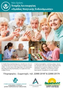 Ο Δήμος Μαρκοπούλου Μεσογαίας ανακοινώνει την έναρξη της «Ομάδας Νοητικής Ενδυνάμωσης», μιας νέας δράσης που υλοποιείται στο πλαίσιο του Συμβουλευτικού Σταθμού Άνοιας, σε συνεργασία με την Εταιρεία Alzheimer Αθηνών και το Ελληνικό Διαδημοτικό Δίκτυο Υγιών Πόλεων.
