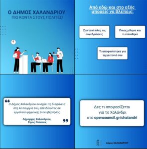Με ομόφωνη απόφαση του Δημοτικού Συμβουλίου, ο Δήμος Χαλανδρίου ενσωματώνει εργαλεία ψηφιακής διακυβέρνησης στη λειτουργία του, μέσω της συνεργασίας του με την OpenCouncil.gr, την πρώτη ελληνική πλατφόρμα που αξιοποιεί την τεχνολογία για να ενισχύσει τη διαφάνεια στη λειτουργία της Αυτοδιοίκησης και το ενδιαφέρον των πολιτών για τις συνεδριάσεις και τις αποφάσεις των δημοτικών συμβουλίων.
