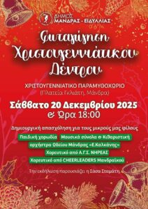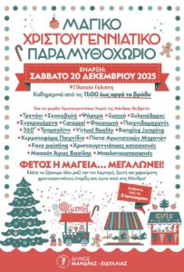 Ο Δήμος Μάνδρας – Ειδυλλίας ανακοινώνει την έναρξη του Μαγικού Χριστουγεννιάτικου Παραμυθοχωριού, το οποίο θα λειτουργήσει από το Σάββατο 20 Δεκεμβρίου 2025 στην Πλατεία Γλιάτη, σηματοδοτώντας την έναρξη των εορταστικών εκδηλώσεων των Χριστουγέννων στη Μάνδρα.