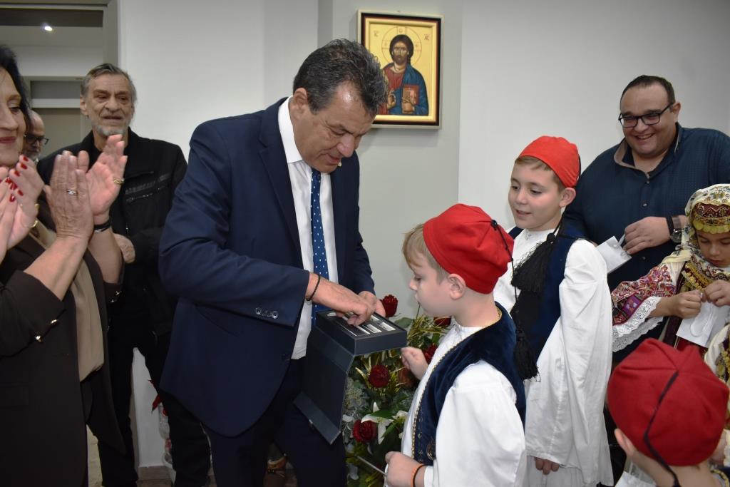 Ωστόσο κι εκείνοι του επιφύλαξαν, ξεχωριστές εκπλήξεις! Για το καλό της νέας χρονιάς, κατά τα αρβανίτικα έθιμα, του πρόσφεραν το παραδοσιακό πορτοκάλι, γούρι και δίπλες ενώ ο Πρόεδρος της ΓΡΙΖΑΣ Σπύρος Μαρίνης και όλα τα μέλη του Διοικητικού Συμβουλίου ως δώρο για την ονομαστική του γιορτή, του παρέδωσαν ένα στυλό, προκειμένου να υπογράψει νέα σημαντικά έργα για τον Δήμο Φυλής.