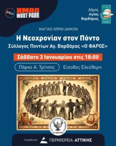 Το Σάββατο 3 Ιανουαρίου στις 6:00 μ.μ. στο Πάρκο Αντώνης Τρίτσης, στο πλαίσιο των εορταστικών εκδηλώσεων, που πραγματοποιούνται υπό την αιγίδα της Περιφέρειας Αττικής και τη συμμετοχή του Δήμου Αγίας Βαρβάρας, ο Σύλλογος Ποντίων ο “Φάρος” της πόλης μας, θα παρουσιάσει την μουσικοχορευτική-αφηγηματική παράσταση “Η Νεοχρονίαν στον Πόντο”.