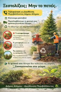 Όποιος επιθυμεί να δώσει το φυσικό Χριστουγεννιάτικο δέντρο του για ανακύκλωση (κομποστοποίηση), μπορεί να καλέσει τον Δήμο Αλίμου (Τμήμα Περιβάλλοντος) στα τηλέφωνα 2109810445 ή 2109810778 (ώρες 7:00 π.μ. – 15:00), για να κλείσει ραντεβού. Ο Δήμος θα περάσει τη συγκεκριμένη ώρα και θα πάρει το αφημένο έξω δέντρο, ακόμη κι αν εκείνη τη στιγμή απουσιάζουν οι ιδιοκτήτες.