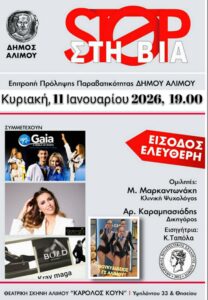 Η Επιτροπή Πρόληψης Παραβατικότητας του Δήμου Αλίμου λέει «STOP στη Βία» μέσω του Αθλητισμού. Αθλητικοί σύλλογοι, σωματεία, πρωταθλητές, με πανελλαδικές και διεθνείς διακρίσεις, δίνουν το «παρών» και στέλνουν ένα ηχηρό μήνυμα κατά της παιδικής βίας και παραβατικότητας.