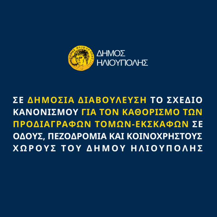 Σύμφωνα με την υπ’ αριθμόν 793/2025 απόφαση της Δημοτικής Επιτροπής, κατ’ εφαρμογή της § 2 του άρθρου 79 του Ν.3463/2006, ο Δήμος Ηλιούπολης προβαίνει σε διαβούλευση και καλεί τους αρμόδιους κοινωνικούς και επαγγελματικούς φορείς και ομάδες πολιτών, να υποβάλουν τις παρατηρήσεις και τις προτάσεις τους, για το παρακάτω θέμα, το οποίο εμπίπτει στην §1 του άρθρου 79 του Ν.3463/2006: