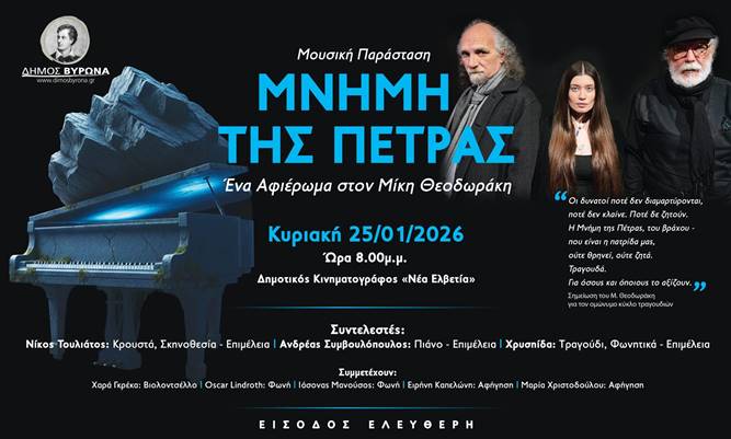 Ο Δήμος Βύρωνα παρουσιάζει τη μουσική παράσταση «Μνήμη της Πέτρας», ένα λιτό και βαθιά συγκινητικό αφιέρωμα στον Μίκη Θεοδωράκη, βασισμένο στον ομώνυμο κύκλο τραγουδιών του. Μέσα από μουσική, τραγούδι και αφήγηση, αναδεικνύεται η δύναμη της μνήμης, της πατρίδας και της συλλογικής συνείδησης.