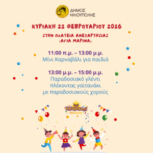 Στις 22 Φεβρουαρίου 2026 και ώρα 11:00 π.μ. – 13:00 μ.μ. ο ∆ήµος Ηλιούπολης διοργανώνει στην Πλατεία Ανεξαρτησίας παιδικό αποκριάτικο πάρτι µε Ξυλοπόδαρους, Μασκότ, Face Painting, µπαλονοκατασκευές, σερπαντίνες, χορό µε συνοδεία DJ για παιδικό ξεφάντωµα, διασκέδαση και λιχουδιές.