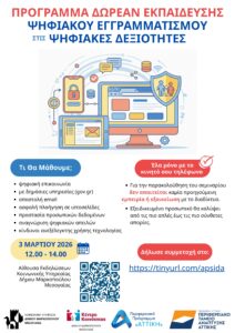 Το σεμινάριο συνδιοργανώνεται από το Κέντρο Κοινότητας του Δήμου Μαρκοπούλου Μεσογαίας, το Περιφερειακό Ταμείο Ανάπτυξης Αττικής (Π.Τ.Α.Α.) και την Περιφέρεια Αττικής, στο πλαίσιο του έργου «Κέντρο Ψηφιακών Δεξιοτήτων» (Επιχειρησιακό Πρόγραμμα «Αττική 2021-2027»), με στόχο την παροχή ψηφιακής εκπαίδευσης ελεύθερα, καθολικά και δωρεάν, ώστε οι πολίτες να μπορούν να αξιοποιούν το διαδίκτυο με ασφάλεια και γνώση, διευκολύνοντας την καθημερινότητά τους.