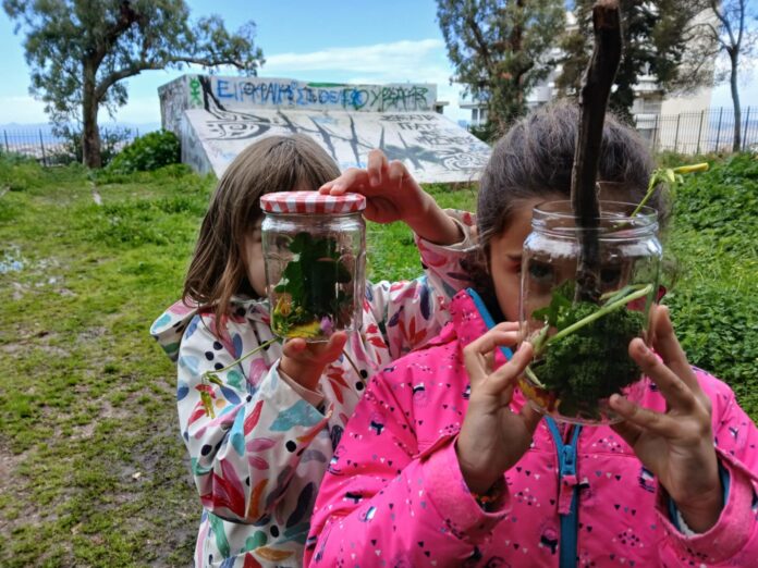 Με τον ήπιο ρυθμό της βροχής να χαρίζει πολύτιμο χρόνο στον κήπο, τα παιδιά εξερεύνησαν τη ζωή του μέσα από τις αισθήσεις, το σώμα και τις γνώσεις τους. Παρατήρησαν τα φυτά και πώς η ανάπτυξή τους επηρεάζεται από τον ήλιο και τη βροχή, γνώρισαν τον κομποστοποιητή και ανακάλυψαν τις κρυφές γωνιές του κήπου. Στη συνέχεια δημιούργησαν κατασκευές που χαρτογραφούσαν τη διαδρομή τους, αποκτώντας μια ουσιαστική σχέση με τον χώρο, το σώμα τους και τα εικαστικά μέσα, μέσα από μια πολυεπίπεδη δημιουργική εμπειρία.