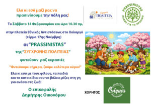 Η προσπάθεια για έναν πιο όμορφο και βιώσιμο Δήμο συνεχίζεται με μια νέα συμβολική και ουσιαστική δράση. Οι PRASSINISTAS της «Σύγχρονης Πολιτείας», με επικεφαλής τον Δημήτρη Οικονόμου, δίνουν νέο ραντεβού με τους πολίτες για να ενισχύσουν το αστικό πράσινο της πόλης μας.