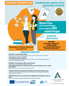Τα σεμινάρια του Σχολείου ξεκινούν τη Δευτέρα 2 Μαρτίου και αφορούν τέσσερις συναντήσεις μέσα στον μήνα που θα γίνουν στο δημοτικό Πολιτιστικό Πολύκεντρο «Ηλέκτρα Αποστόλου» (Κουντουριώτου και Νεότητος) με κοινή ώρα 17.00 με 20.00 το απόγευμα.
