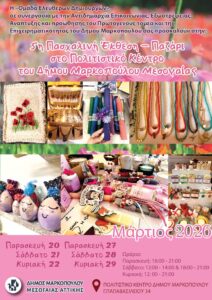 Στον ιστορικό χώρο του Πολιτιστικού Κέντρου, θα παρουσιάζονται και θα διατίθενται απευθείας από τα χέρια των δημιουργών, πασχαλινά είδη, χειροποίητα κοσμήματα και αξεσουάρ, είδη προσωπικής φροντίδας από αγνές πρώτες ύλες, κεριά, μαρμελάδες, γλυκά κουταλιού και πολλά άλλα. Δημιουργίες 100% χειροποίητες και οικολογικά βιώσιμες, μοναδικά κομμάτια με ελληνική ταυτότητα, κοσμήματα και αξεσουάρ, που το καθένα κρύβει μια τεχνική και μια ιστορία.
