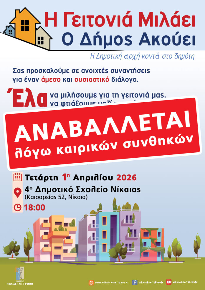Η προγραμματισμένη συνάντηση του Δημάρχου Νίκαιας-Αγίου Ιωάννη Ρέντη Κωνσταντίνου Μαραγκάκη και της Δημοτικής Αρχής με τους δημότες στο 4ο Δημοτικό Σχολείο Νίκαιας«Η Γειτονιά Μιλάει – Ο Δήμος Ακούει» αναβάλλεται λόγω της επικείμενης κακοκαιρίας και των έντονων καιρικών φαινομένων που αναμένονται την Τετάρτη 1η Απριλίου, σύμφωνα με τις προβλέψεις της Εθνικής Μετεωρολογικής Υπηρεσίας και τις οδηγίες της Πολιτικής Προστασίας,