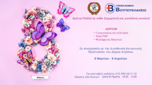 Με αφορμή την Παγκόσμια Ημέρα της Γυναίκας (8 Μαρτίου), η Διεύθυνση Κοινωνικής Προστασίας του Δήμου Αιγάλεω ένωσε τις δυνάμεις της με τη Γενική Κλινική Δυτικής Αττικής «Βουγιουκλάκειο» Α.Ε., αξιοποιώντας τη σημαντική προσφορά της στο πλαίσιο των δράσεων εταιρικής κοινωνικής ευθύνης, και διοργανώνει Δωρεάν Γυναικολογικές Εξετάσεις.