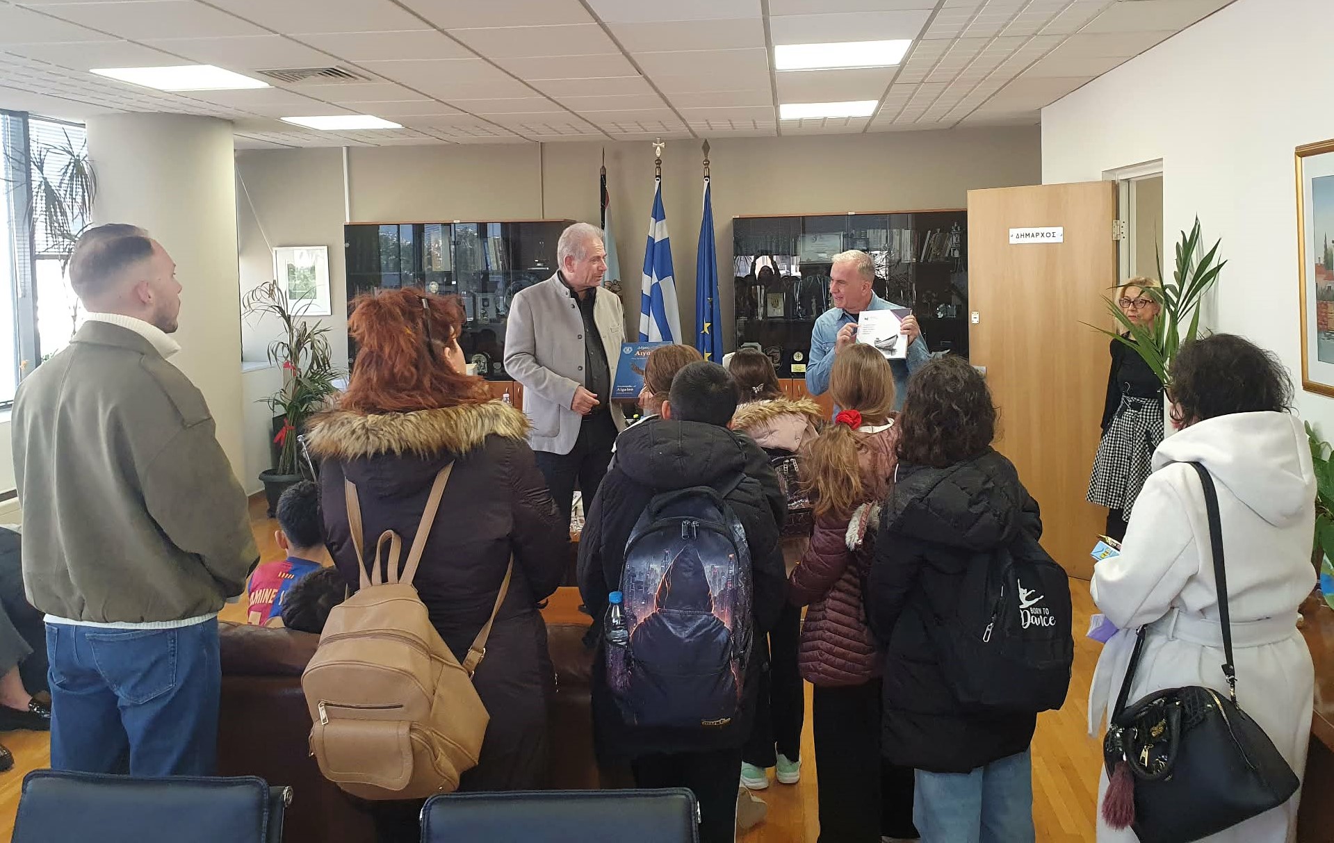 Τα παιδιά υποδέχτηκαν στο Δημαρχείο ο Δήμαρχος Αιγάλεω, Λάμπρος Σκλαβούνος και ο Αντιδήμαρχος Παιδείας & Νέας Γενιάς, Γιάννης Κουτούλιας, οι οποίοι συνομίλησαν μαζί τους σε ένα ιδιαίτερα ζωντανό και ουσιαστικό κλίμα.
