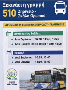 Ο Δήμος Ωρωπού ενημερώνει τους δημότες ότι, σύμφωνα με την ανακοίνωση του ΟΑΣΑ, τίθεται σε λειτουργία η νέα λεωφορειακή γραμμή 510 «Ζηρίνειο – Μαρκόπουλο – Σκάλα Ωρωπού», η οποία συνδέει απευθείας την Κηφισιά με τη Σκάλα Ωρωπού.