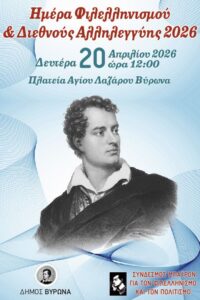 Ο Δήμος Βύρωνα και ο Σύνδεσμος Μπάιρον για τον Φιλελληνισμό και τον Πολιτισμό, σας προσκαλούν στην καθιερωμένη εκδήλωση για την Ημέρα Φιλελληνισμού και Διεθνούς Αλληλεγγύης, η οποία φέτος θα πραγματοποιηθεί την Δευτέρα 20 Απριλίου 2026 και ώρα 12.00 το μεσημέρι, στην Πλατεία Αγίου Λαζάρου Βύρωνα, με το καθιερωμένο περιεχόμενο: επιμνημόσυνη δέηση, καταθέσεις στεφάνων, ομιλίες και απαγγελίες.