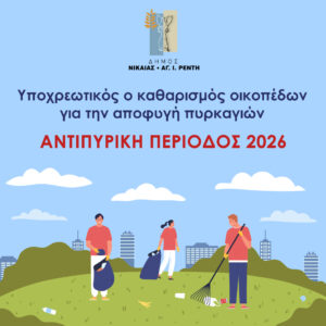 Ενόψει της αντιπυρικής περιόδου 2026, ο Δήμος Νίκαιας-Αγίου Ιωάννη Ρέντη ενημερώνει τους ιδιοκτήτες, νομείς και επικαρπωτές οικοπέδων για την υποχρέωσή τους να προχωρήσουν στον καθαρισμό των ιδιοκτησιών τους από ξερά χόρτα, απορρίμματα και άλλα εύφλεκτα υλικά, συμβάλλοντας έτσι στην πρόληψη και την αποτελεσματικότερη προστασία από πυρκαγιές.