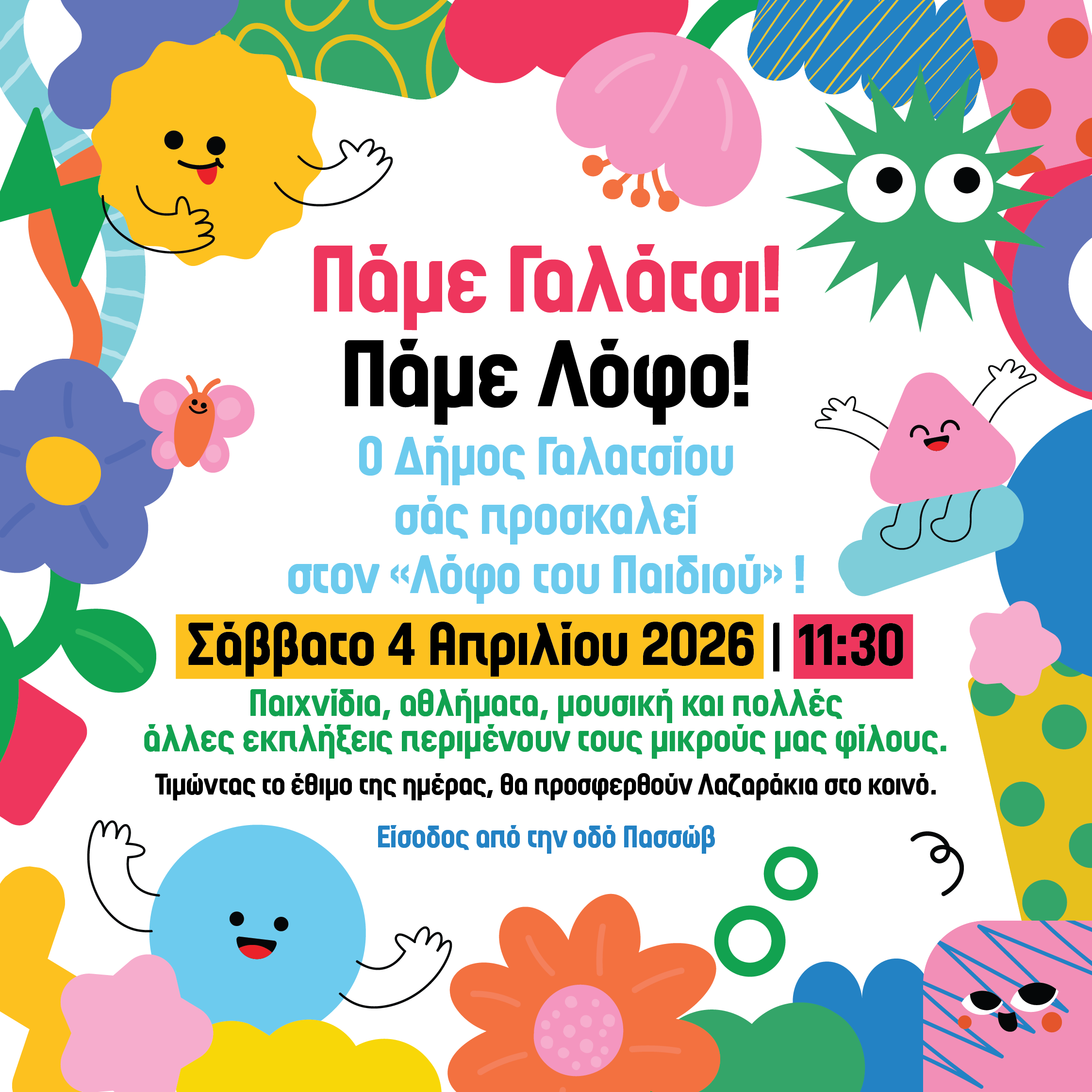 Πάμε Γαλάτσι! Πάμε Λόφο!Σας προσκαλούμε στα εγκαίνια που θα πραγματοποιηθούν στον «Λόφο του Παιδιού», το Σάββατο 4 Απριλίου 2026 στις 11:30.